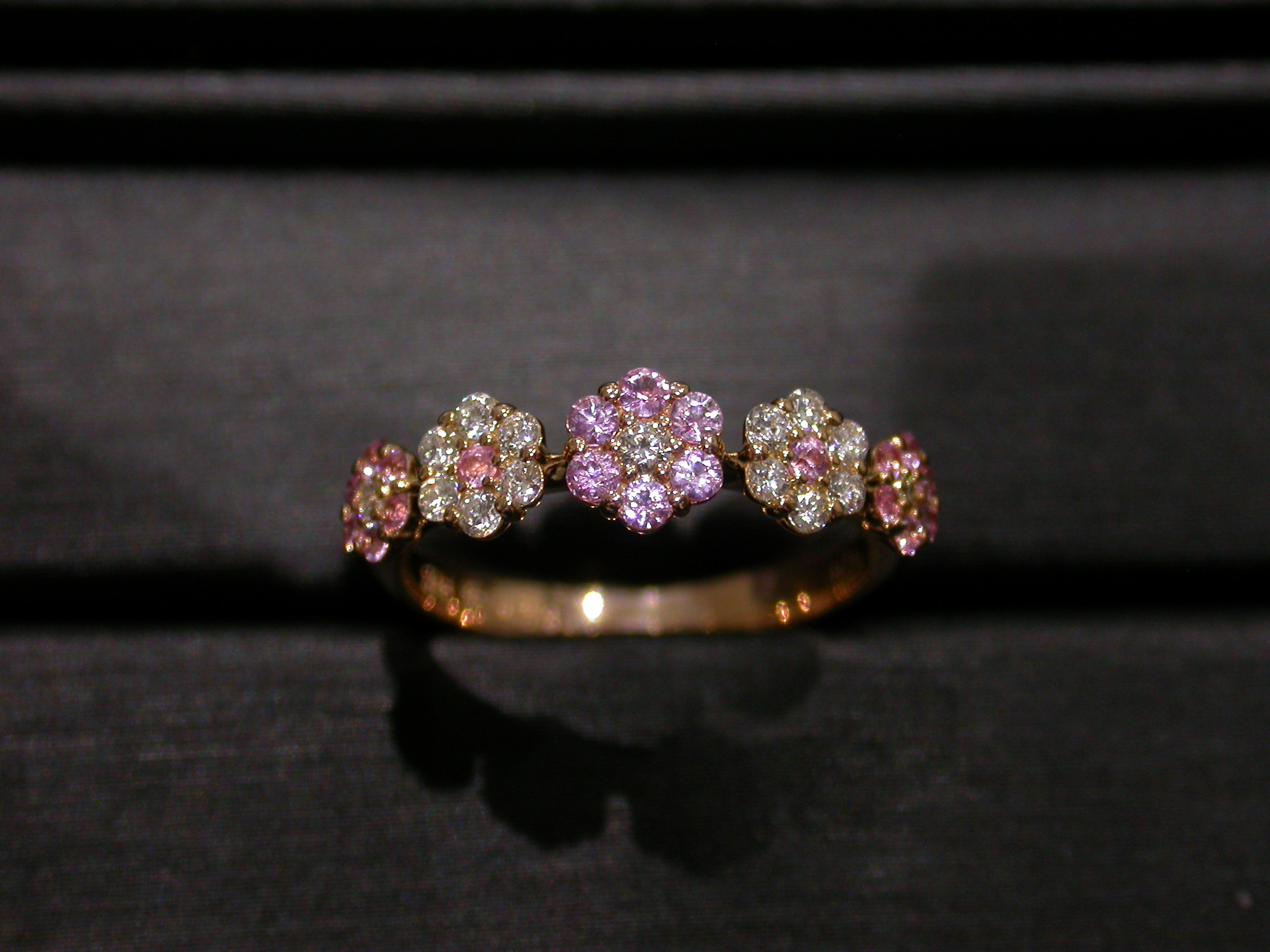ピンクサファイアとダイヤモンドが上品に輝くフラワーモチーフのリングです。